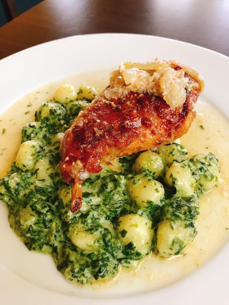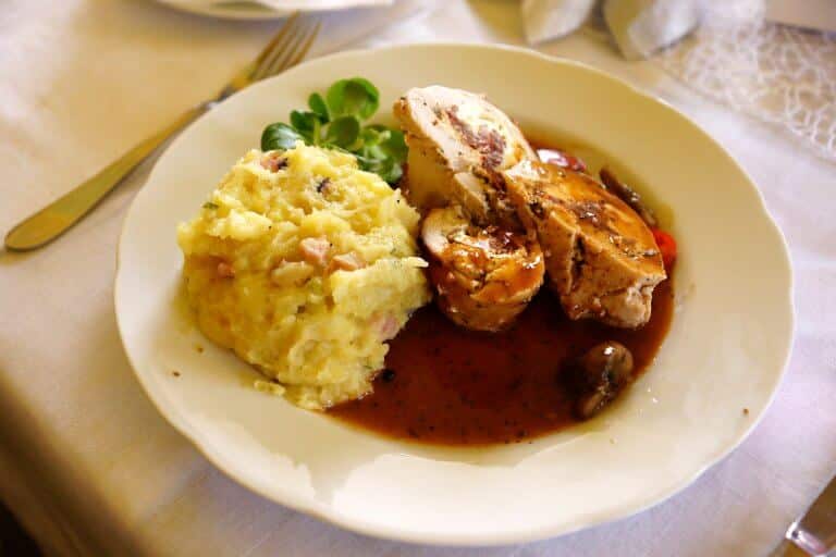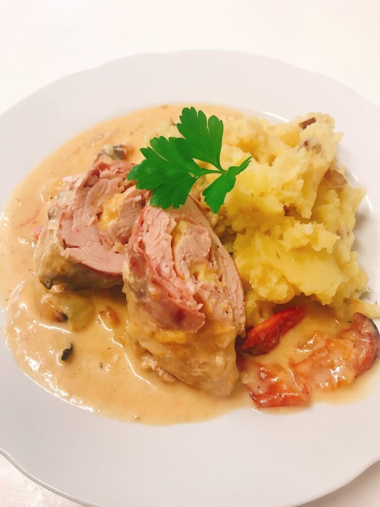 200g Kuřecí steak s uzeninou a pórkem přelitý smetanovo-nivovou omáčkou